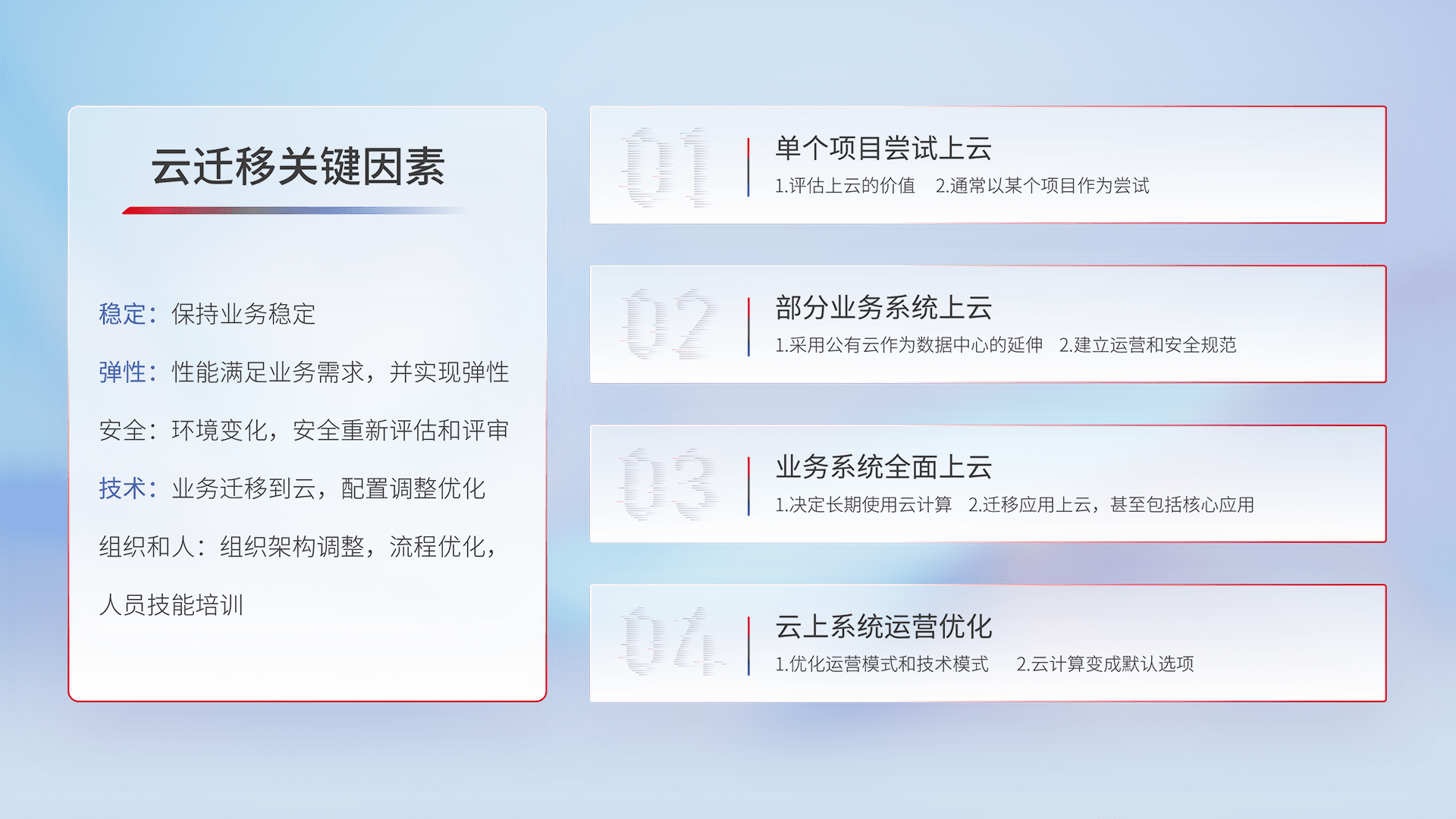 结合实际业务,,,,从规划设计、、、云平台选型、、、云原生改造、、、数据迁移、、、、集成交付,,,,迁移全过程为客户识别最佳上云路径,,做好风险识别管理,,,设计网络架构、、、身份权限、、安全审计合规、、操作审计、、、、日志审计、、监控告警策略、、多站点容灾设计等,,对云上基础设施进行整体规划,,,,提升IT治理水平,,以满足弹性、、、、高可用、、、高性能的需求。。