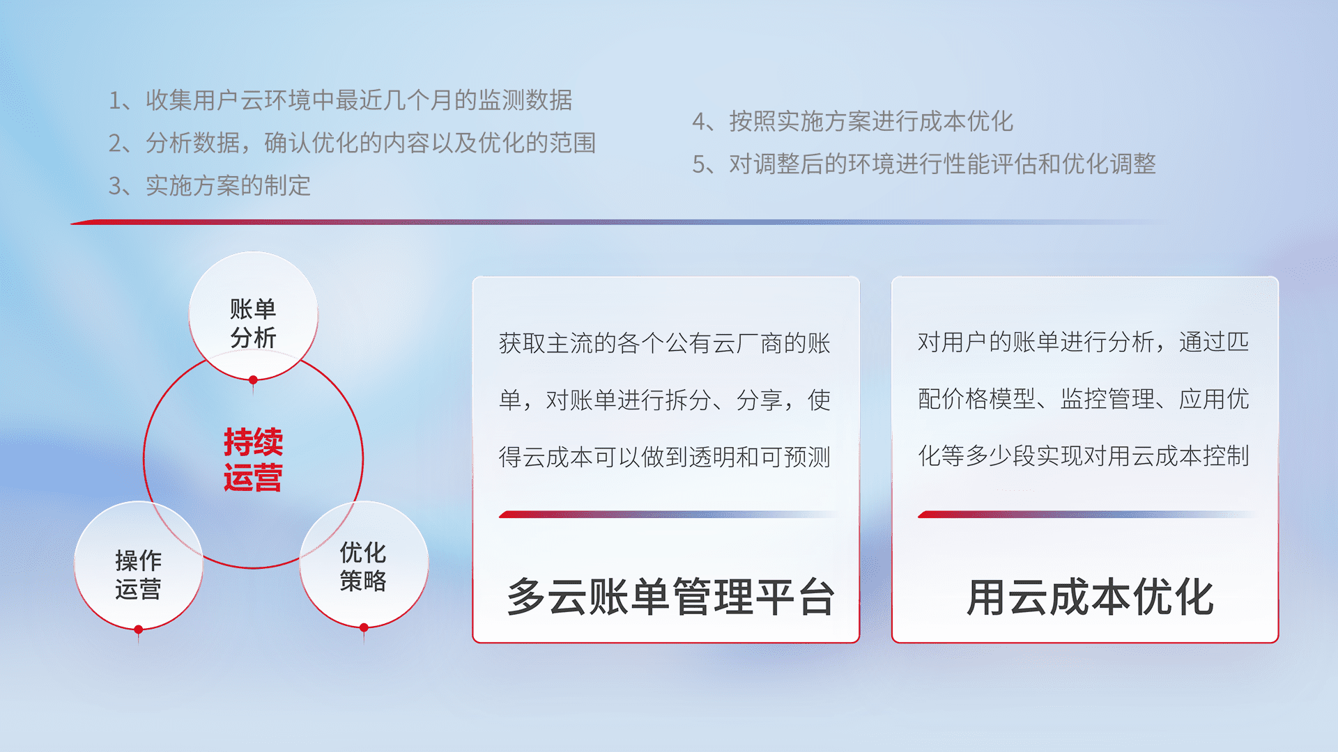 通过多云纳管,,以统一的资源数据模型把客户的云资源进行抽象和封装,,,,进而实现对多云资源的统一操作,,保障云资源管理的可靠性、、稳定性与可用性。。。量身定制化运维内容,,,配置、、、、开发运维、、、补丁管理、、备份、、监控、、、认证和访问管理、、、、审计和日常巡检等,,,,保障在用云过程中的可靠度,,,稳定度以及高可用率。。。